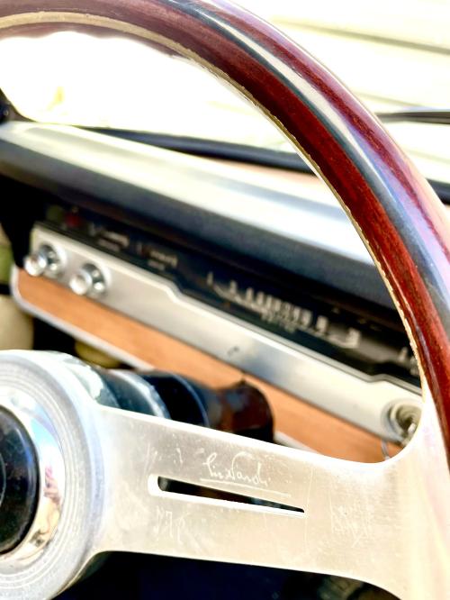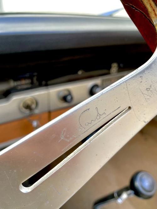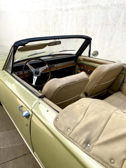 INTERIORES: El interior fue mejorado por Serra con inserciones en imitación de madera y un volante Nardi, como era típico en las realizaciones de Serra. Ha sido retapizado en simil cuero de color claro en la restauración, que está en buen estado, pero aún necesita unos últimos retoques de montaje para quedar finalizado. La capota tiene un sistema hidráulico para desplegarla automáticamente, que parece de fabricación moderna.
