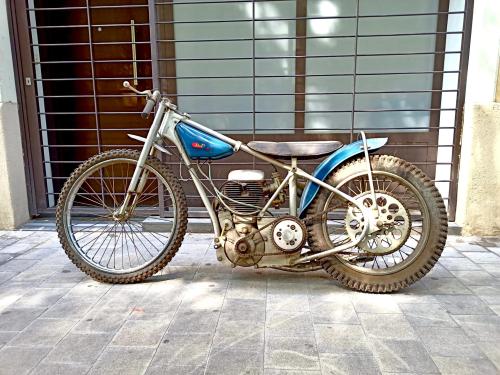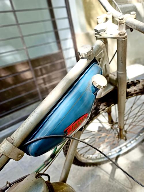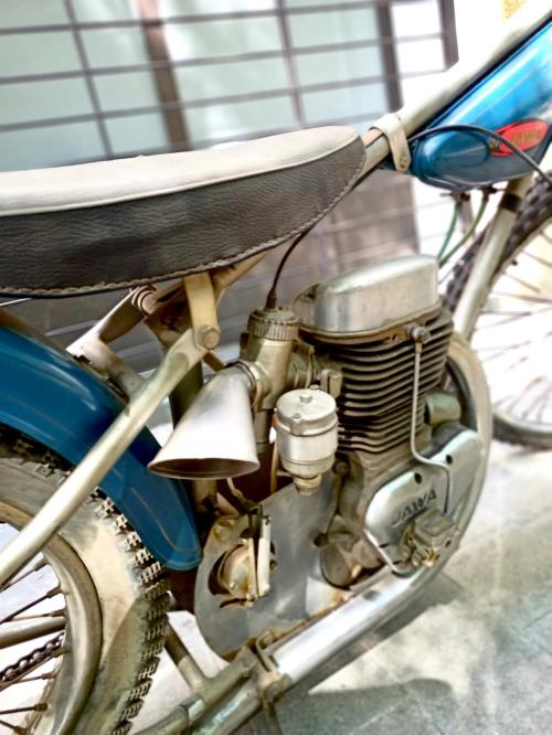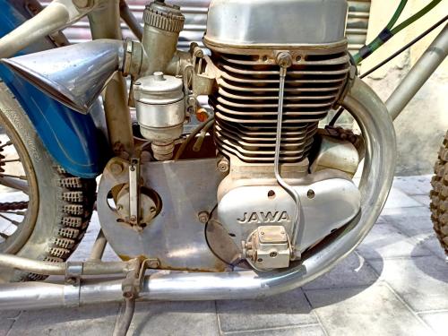 HISTORIA: Jawa diseñó la DT 890 para las carreras de speedway, disputadas normalmente en circuitos ovales de tierra o arena, de entre 400 y 600 metros de recorrido. Entre años sesenta y ochenta la marca checa dominaría esta especialidad deportiva ganando un sinfín de títulos en todo el mundo con sus motos. El chasis está formado por tubos de acero soldados y reforzados para asegurar la máxima rigidez. Lleva un pequeño depósito de 25 litros montado sobre soportes eláticos y carece de frenos. El motor va alimentado por un carburador de 34 mm y rinde unos 60 CV de potencia, que transmite directamente a la rueda trasera sin necesidad de caja de cambio. Se desconoce el historial y palmarés de esta unidad, que se muestra completa y bien preservada, seguramente en el mismo estado que debía tener cuando dejó de competir.