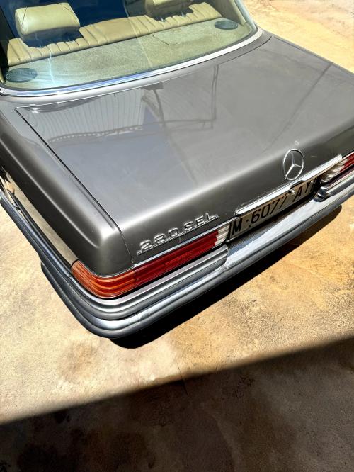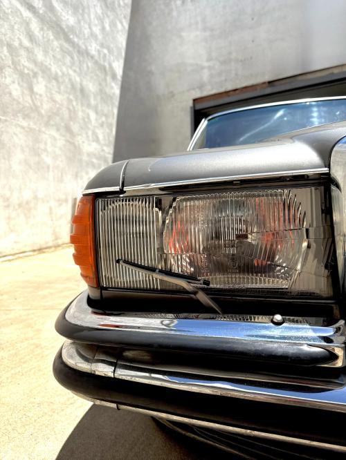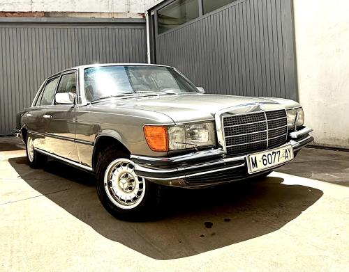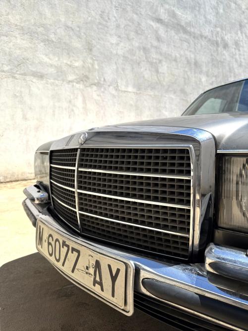 HISTORIA: Esta unidad fue originalmente matriculada en Madrid en 1975, con unas características bastante inusuales, pues se trata de un W116 (la berlina de representación de la marca en la época) pero con el motor «pequeño», chasis largo y cambio manual. Incluye varios extras de la época como son el techo corredero, las llantas «barrocas» o los lavafaros delanteros. Se ha conservado en estado muy original, aunque no se conservan el historial de propietarios ni de revisiones periódicas para comprobar el kilometraje. Su último dueño lo posee desde hace 30 años.