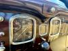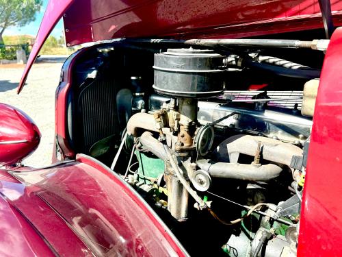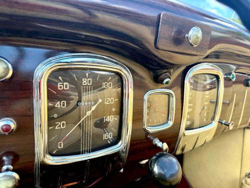 INTERIORES: La influencia europea de la carrocería se traslada al habitáculo para cinco pasajeros. Las amplias puertas, con forma de bóveda, se abren para revelar asientos delanteros individuales tapizados con una preciosa tapicería de cuero color beis. Los paneles de las puertas, los asientos traseros y los ribetes de la alfombra lucen el mismo cuero a juego. El audaz tablero con efecto madera veteada es un elemento claramente estadounidense, con detalles art déco y un hermoso cuadro de instrumentos rectangular central, que incluye un velocímetro calibrado en kilómetros. Otros detalles destacables incluyen las magníficas molduras de las puertas de madera. La capota de lona negra está en buen estado e incluye una funda de maletero de lona a juego.