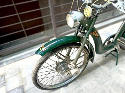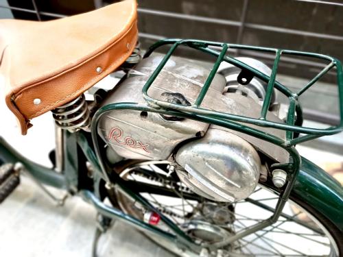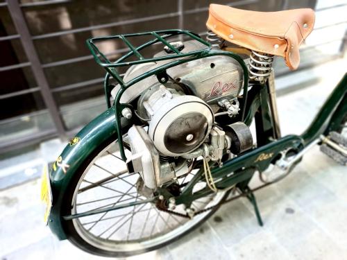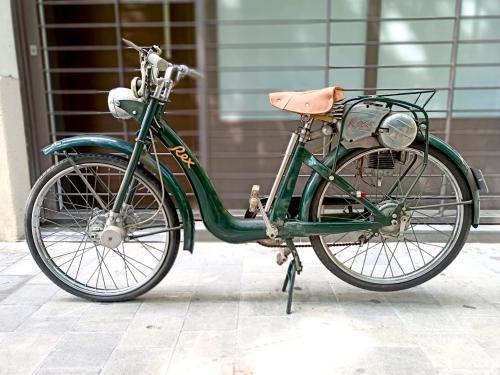 HISTORIA: A pesar de su modesta potencia, el motor auxiliar que impulsa esta bicicleta forma parte de un curioso capítulo de la historia de la industria española del motor. Producido entre 1953 y 1960, tuvo escaso recorrido comercial al verse eclipsado por la aparición del Seat 600, como todo el sector de las dos ruedas, pero su fabricante, Construcciones Mecánicas Rex, era uno de los más antiguos del país; había iniciado su actividad en 1913 bajo otra denominación social, dedicado a la realización de motores industriales. Dos años después incorporó a un joven y prometedor ingeniero llamado Wifredo Ricart, que más adelante iba a desarrollar una brillante carrera bien conocida, principalmente en la marca Pegaso. En 1953, ya desvinculado de la empresa, Ricart diseñaría para Rex este pequeño motor con el cilindro invertido, el depósito de combustible y el silencioso de escape formando un bloque. Montado sobre la rueda trasera, transmite su fuerza sobre el neumático mediante un rodillo de fricción. Con encendido por volante magnético y carburador de patente propia, rinde 1,2 CV que le permiten alcanzar 45 km/h con un consumo de 1,8 litros cada 100 km. El ejemplar que se subasta corresponde a la segunda versión del modelo, dotado de un bastidor de ciclomotor más robusto que el de una bicicleta, e incluso con suspensión delantera. Fue cuidadosamente restaurado por su anterior dueño, que había iniciado su carrera profesional en Construcciones Mecánicas Rex como aprendiz de mecánico.