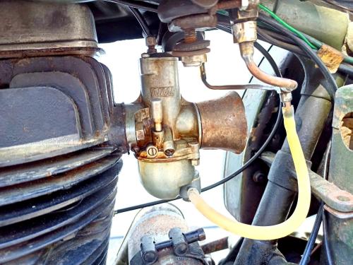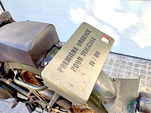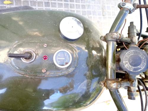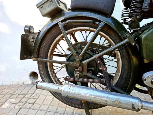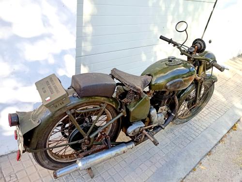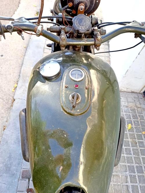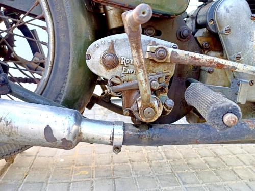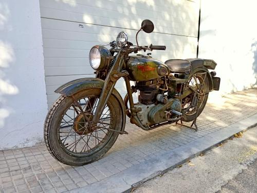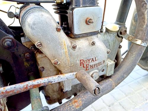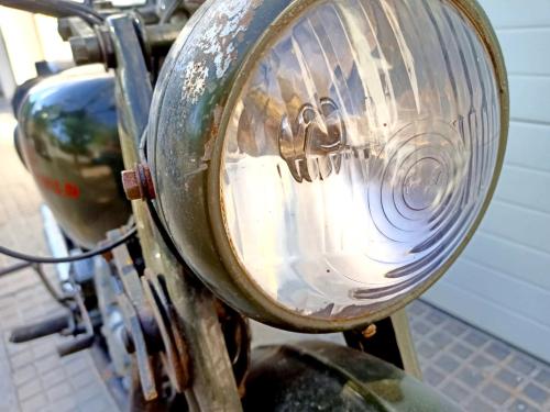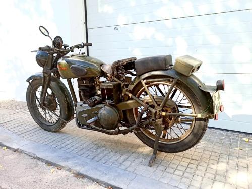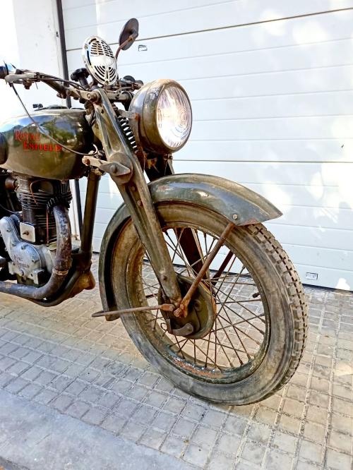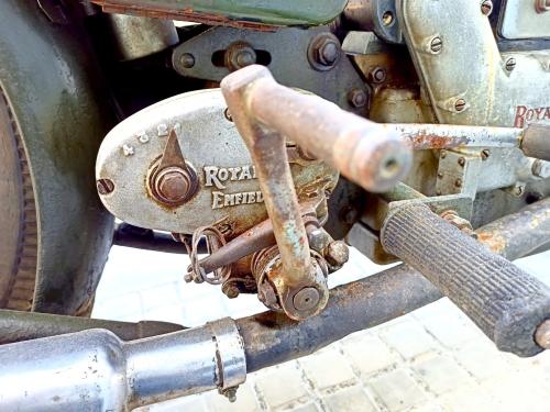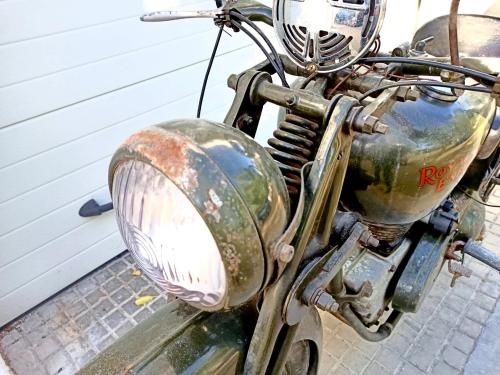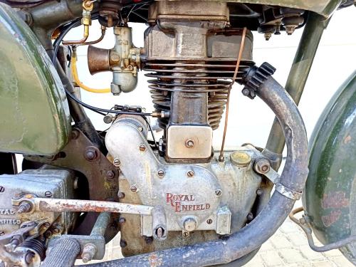 HISTORIA: Durante la segunda guerra mundial, Royal Enfield suministró a las fuerzas armadas británicas y a diversos ejércitos de los países aliados casi 30.000 unidades de su modelo C adaptada a usos militares, inicialmente de la versión WD/C con motor de válvulas laterales y a partir de 1942 de su evolución WD/CO, más potente y ya dotada de válvulas en cabeza, caja de 4 relaciones con selectopr al pie, encendido por bobina y lubricación por cárter seco con el depósito de aceite dentro del cárter. La unidad subastada nunca fue restaurada, se mantiene en estado de origen y a pesar de su aspecto ha estado funcionando regularmente hasta hace poco tiempo.